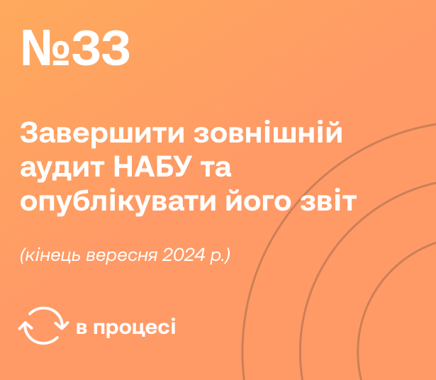Українська сторона має завершити зовнішній аудит ефективності НАБУ за участю трьох незалежних експертів із міжнародним досвідом та опублікувати його звіт.