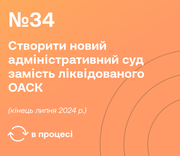 Українська сторона зобов’язалася ухвалити закон про створення нового суду, який розглядатиме адміністративні справи проти центральних органів державної влади (наприклад, НБУ, НАБУ, НАЗК) суддями, які пройшли належну перевірку на професійну компетентність та доброчесність.